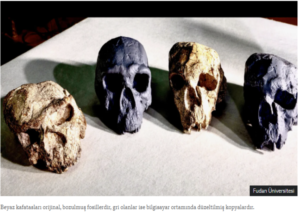 eyaz kafatasları orijinal, bozulmuş fosillerdir, gri olanlar ise bilgisayar ortamında düzeltilmiş kopyalardır.